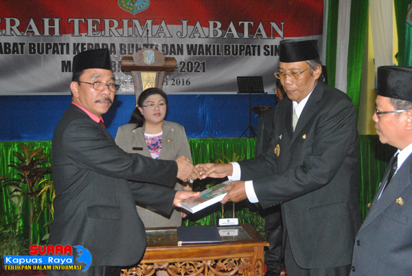 SINTANG, SKR.COM – Penjabat Bupati Sintang Alexius Akim secara resmi menyerahkan tongkat kepimpinan Kabupaten Sintang kepada Bupati dan Wakil Bupati Terpilih dalam acara serah terima jabatan yang dilaksanakan pada Jumat, (26/2/2016) di Gedung Pancasila.