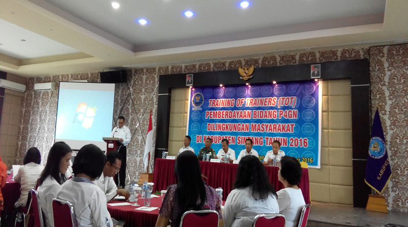 SINTANG, SKR.COM – Asisten Perekonomian dan pembangunan Setda Sintang, Drs. Lindra Azmar,M.Si, mewakili Wakil Bupati Sintang, Drs. Askiman, MM membuka acara Training of trainers (TOT) Pemberdayaan bidang P4GN di lingkungan masyarakat di Kabupaten Sintang, Hotel My Home, Rabu (9/11/2016) pagi.
