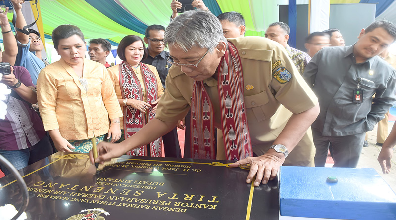 SINTANG, SKR.COM – Bupati Sintang, Jarot Winarno meresmikan gedung baru kantor Perusahaan Daerah Air Minum Tirta Senentang yang ditandai dengan menekan tombol sirene dan penandatanganan prasasti, didampingi oleh Sekretaris Daerah, Ketua DPRD, Pimpinan SKPD, Forkopimda, pada Selasa (28/2).