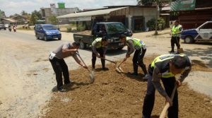 Mengancam Keselamatan, Polres Sekadau Timbun Jalan Provinsi Yang Berlobang