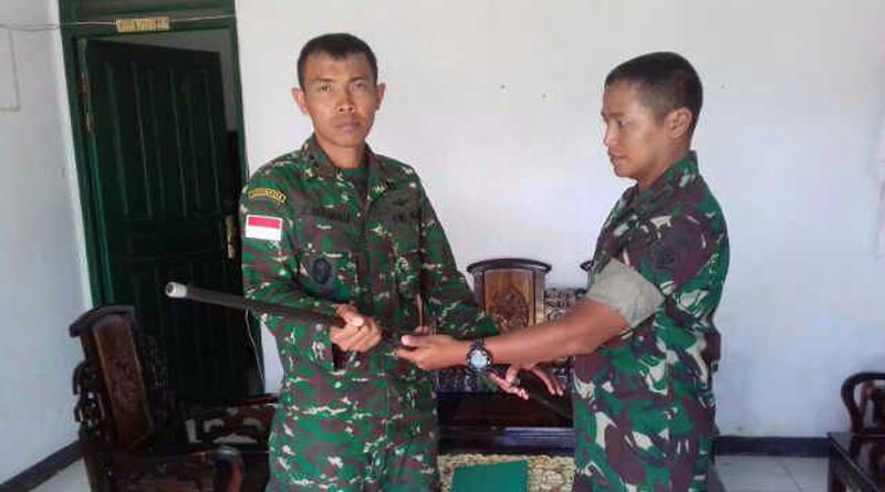 Komandan Detasemen Peralatan “A” 12-12-01/Stg Letkol Cpl Muchamad Andi Barata, S.E. saat Melaksanakan Asistensi Teknik Di Pos-Pos Perbatasan beberapa waktu lalu, menerima penyerahan senpi dari Satgas yang berhasil dikumpulkan dari masyarakat.