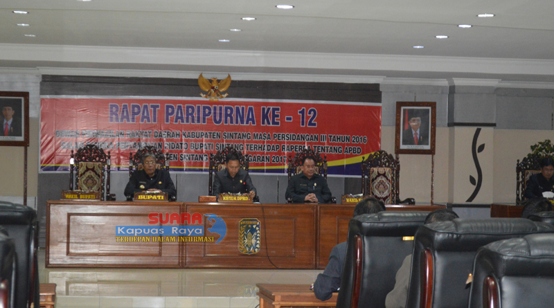 SINTANG, SKR.COM – Dewan Perwakilan Rakyat Daerah (DPRD) Kabupaten Sintang menggelar Rapat Paripurna Ke-12 Masa Persidangan III Tahun 2016 Dalam Rangka Penyampaian Nota Keuangan Terhadap Raperda Tentang Anggaran Pendapatan Dan Belanja Daerah Kabupaten Sintang Tahun Anggaran 2017, Kamis (24/11/2016) di Ruang Sidang DPRD Sintang.