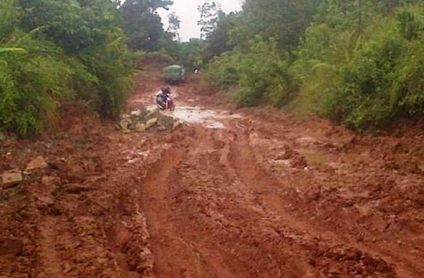 Jalan yang kondisinya masih tanah kuning atau belum dilakukan peningkatan itu, kini sudah bagaikan kubangan kerbau. Terlebih pada saat curah hujan tinggi truk angkutan perusahaan yang sering melaluinya.