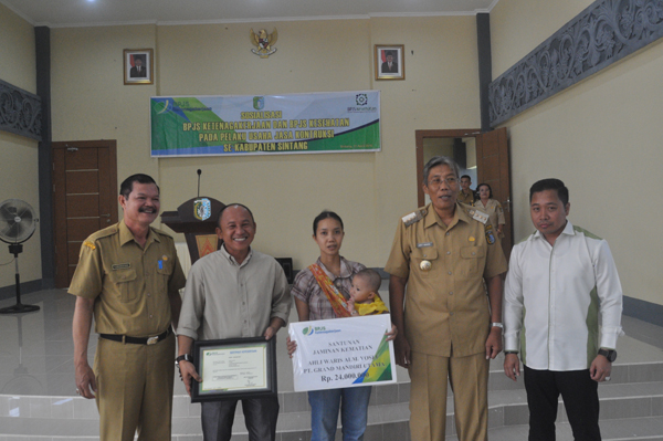 Dalam kesempatan tersebut, Bupati Sintang menyerahkan santunan jaminan kematian dari BPJS Ketenagakerjaan kepada Veronika selaku istri dan ahli waris dari Alm Yosef.