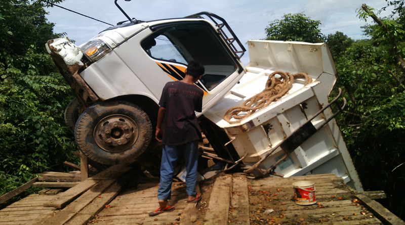 SEKADAU, SKR.COM – Salah satu jembatan yang menjadi sarana penghubung antara Dusun Setapang, Desa Perongkan dengan Dusun Natai Ubah, Desa Tinting Boyok, ambruk Senin (20/6) siang. Satu unit truk yang kala itu sedang melintas di atas jembatan nyaris terjerumus ke sungai. Beruntung, bagian depan truk masih tersangkut ke badan jembatan.