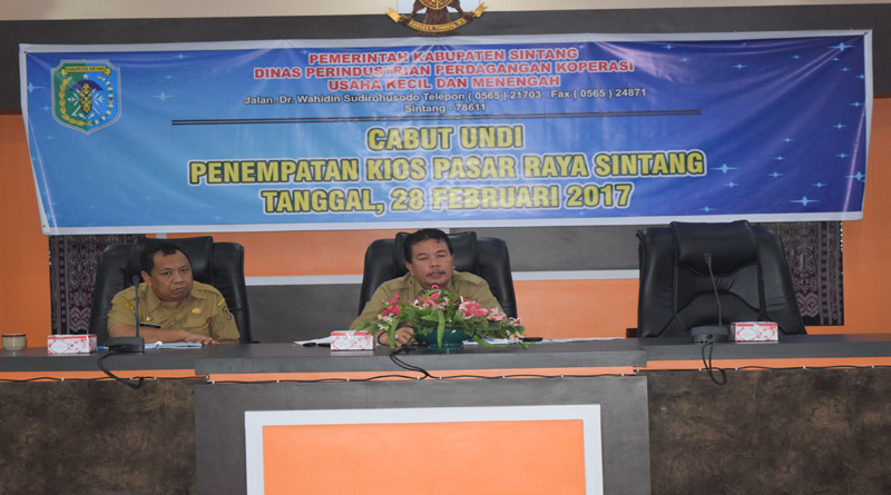 SINTANG, SKR.COM – Mewakili Bupati Sintang, dr. Jarot Winarno, M.Med.Ph, Kepala Dinas Perindustrian Perdagangan Koperasi Usaha Kecil dan Menengah (Disperindagkop), H. Sudirman, S.Sos,.M.Si bersama Inspektur Kabupaten Sintang, Apolonaris Biong, S.Sos.M.Si saat menghadiri acara cabut undi penempatan kios Pasar Raya Sintang di Balai Praja Kompleks Kantor Bupati Sintang, Selasa (28/2/2017).