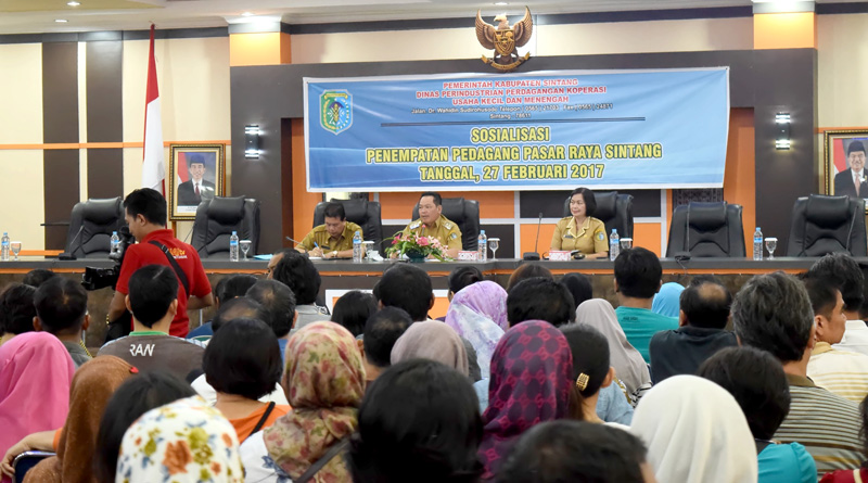 SINTANG, SKR.COM – Kebakaran pasar inpres pada tahun 2012 silam menghanguskan sekitar 200an lebih kios para pedagang yang terletak didepan terminal pasar inpres tersebut, kini pada tahun 2017 pembangunan kembali pasar raya sintang sudah selesai namun penempatannya masih belum dilakukan, maka dari itu Pemerintah Daerah Kabupaten Sintang melalui Dinas Perindustrian Perdagangan Koperasi dan Usaha Kecil Menengah mengadakan sosialisasi penempatan pasar raya yang diselenggarakan di Balai Praja Kantor Bupati Sintang pada Senin (27/2).