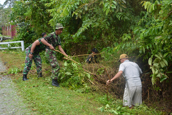 SINTANG, SKR.COM – Dalam rangka memperingati hari Juang Ke- 70 tahun 2015, Prajurit se-Garnisun Sintang bersama masyarakat menggelar karya bhakti di Desa Baning kota, Jumat (11/12/2015.