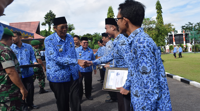 Bupati Sintang H. Jarot Winarno saat membacakan amanat Presiden Republik Indonesia Joko Widodo yang juga Penasihat Nasional KORPRI, menyampaikan penghargaan yang tinggi kepada segenap keluarga besar KORPRI yang sudah dan sedang mengemban tugas, langgungjawab, setta pengabdian kepada negara, bangsa. dan rakyat, di seluruh penjuru tanah air dan dunia.