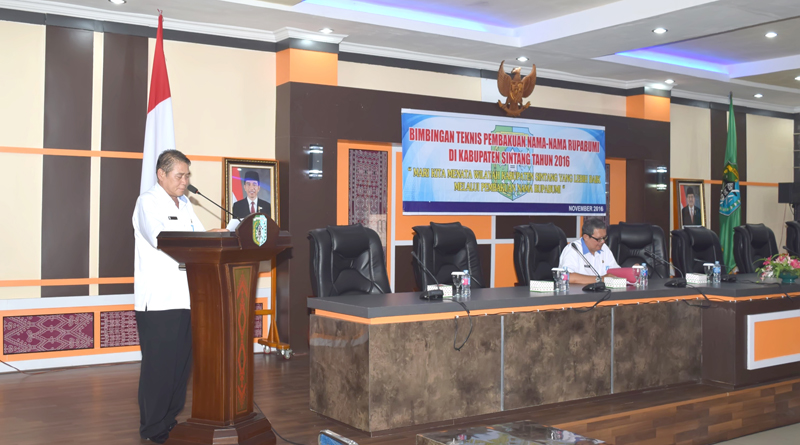 SINTANG, SKR.COM – Assisten Administrasi Umum Sekretariat Daerah Kabupaten Sintang, Ir. H. Zulkarnaen, M.Si membuka secara resmi kegiatan bimbingan teknis tentang pembakuan nama rupa bumi di Kabupaten Sintang tahun 2016, bertempat di Balai Praja Kantor Bupati Sintang, Rabu (23/11).