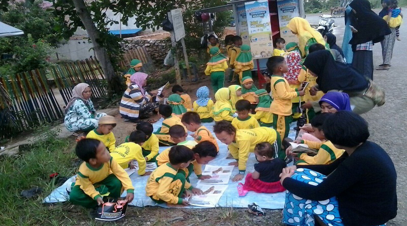 Jam menunjukan pukul 10.00 WITA tim perpusling PKPU sudah tiba di PAUD Ratna Ceria , anak-anak nampak langsung berlarian berkumpul untuk menyambut tim perpusling. Hanya bermodalkan motor yang telah dimodifikasi sehingga menjadi perpustakaan berjalan, Angga petugas perpusling PKPU menyambut anak-anak yang rata-rata umurnya belum genap 6 tahun.