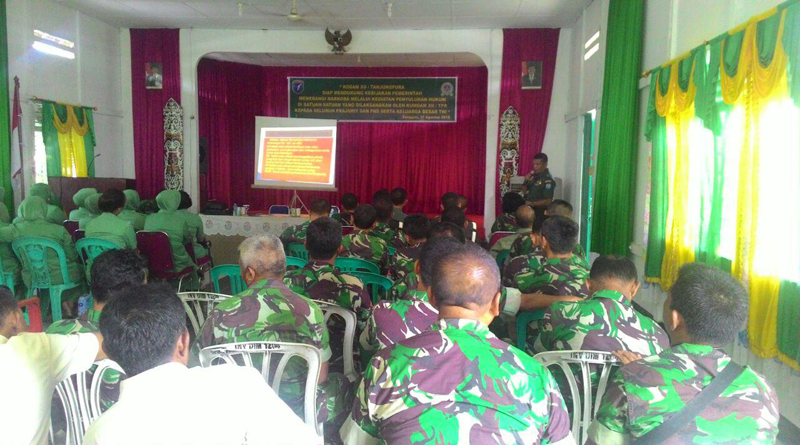 Penyuluhan Hukum disampaikan oleh Perwira Hukum Kodam XII/Tpr Mayor Chk Molana Jemy G.M, S.H, M.H., beserta Lettu Chk Octo Marpaung, S.H., dengan tema ” Kodam XII/Tanjungpura Siap Mendukung Kebijakan Pemerintah Memerangi Narkoba Melalui Kegiatan Penyuluhan Hukum Di Satuan-Satuan Yang Dilaksanakan Oleh Kumdam XII/Tpr Kepada Seluruh Prajurit Dan PNS Serta Keluarga Besar TNI “.