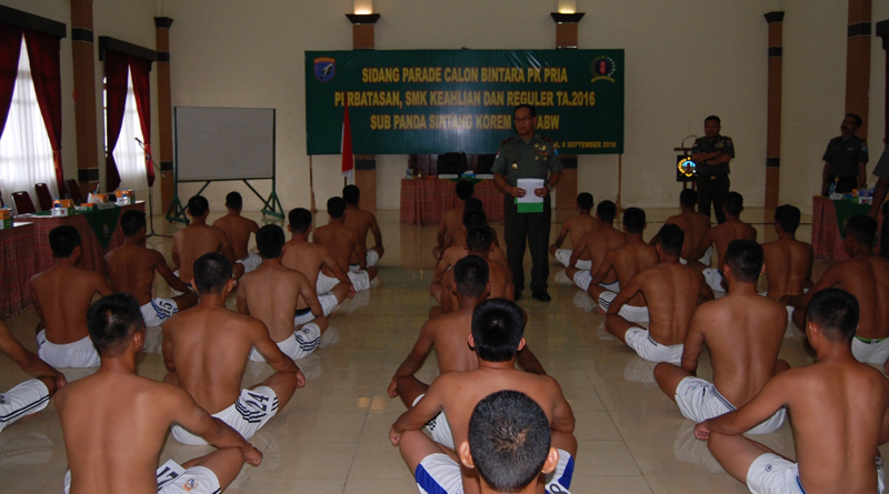 SINTANG, SKR.COM – Komandan Korem 121/Alambhana Wanawai Brigjen TNI Widodo Iryansyah, S.Sos.,M.M. memimpin Sidang Parade Calon Bintara PK TNI AD Pria perbatasan, SMK Keahlian dan Reguler TA 2016 Sub Panda Sintang Korem 121/Abw, bertempat di Aula Balai Prajurit Makorem 121/Abw Jalan Pangeran Kuning no. 1 Sintang Kamis (8/9) kemarin.
