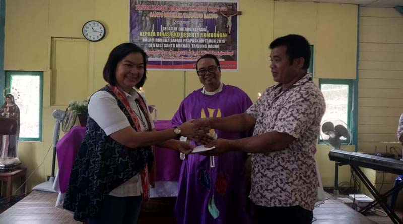 SINTANG, SKR.COM – Sekretaris Daerah Kabupaten Sintang, Dra. Yosepha Hasnah, M.Si menyerahkan bantuan kepada umat Katolik di Gereja Stasi St. Mikael Tanjung Baung Kecamatan Ketungau Hilir, Minggu (7/04/2019).