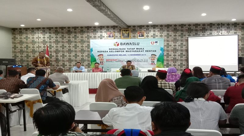 MELAWI, SKR.COM – Badan Pengawas Pemilu (Bawaslu) Melawi melaksanakan sosialisasi tatap muka kepada kelompok masyarakat rentan, Kamis sore (14/11/19) di aula pertemuan salah satu hotel di Desa Sidomulyo, Kecamatan Nanga Pinoh. Kegiatan tersebut dihadiri Bawaslu RI, Fritz Edwar Siregar, Bawaslu Provinsi Kalbar, Ruhermansyah, Bawaslu Sintang, Forkopinda serta sejumlah tokoh dan kelompok organisasi yang ada di Melawi.