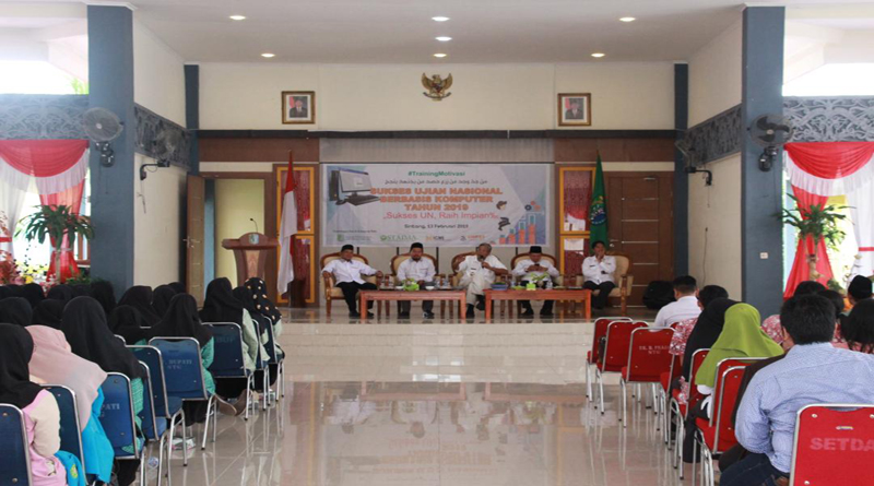 SINTANG, SKR.COM – Bupati Sintang, Jarot Winarno membuka kegiatan Training Motivasi Sukses Ujian Nasional Berbasis Komputer (UNBK) Tahun 2019 dengan tema “Sukses UN, Raih Impian” bertempat di Pendopo Bupati Sintang, Rabu (13/2/19). Kegiatan ini diikuti perwakilan siswa-siswi SMA, SMK dan MA yang ada di Kabupaten Sintang.