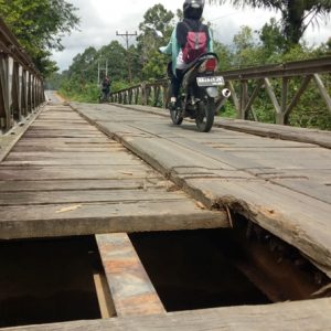 MELAWI, SKR.COM – Jembatan Laur yang berada di Kecamatan Pinoh Selatan, saat ini sudah semakin memprihatinkan. Selain banyak tambalan kayu yang digunakan warga menutupi lubang-lubang, kondisi tiang pembatas serta rangka-rangkanya selengkapnya