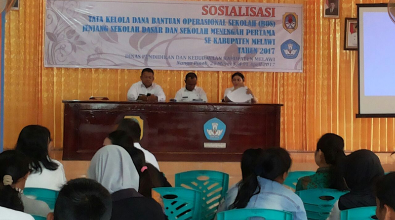 MELAWI, SKR.COM – Disdik Sosialisasikan tata kelola penggunaan dana Biaya Operasional Sekolah (BOS)SD dan SMP tahun 2017, Rabu (29/3) di ruang rapat Dinas pendidikan dan Kebudayaan (Disdikbud) Melawi. Kegiatan tersebut dihadiri seluruh kepala sekolah SMP dan SD se Kabupaten Melawi.