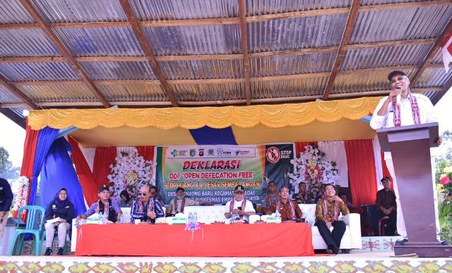 DEDAI, SKR.COM – Bupati Sintang dr. H. Jarot Winarno , M. Med .PH menghadiri acara Deklarasi Open Defecation Free (ODF) atau Stop Buang Air Besar Sembarangan di Desa Menaong, Kecamatan Dedai, Kamis (19/03/2020).