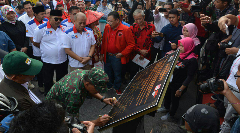 PONTIANAK, SKR.COM – Panglima Kodam XII/Tanjungpura Mayor Jenderal TNI Achmad Supriyadi, didampingi Kasdam XII/Tanjungpura, Asops Kasdam XII/Tpr dan Aster Kasdam XII/Tpr, Tanda Tangani Deklarasi Kampanye Damai Pemilihan Gubernur dan Wakil Gubernur Kalimantan Barat Tahun 2018, dilaksanakan di Jalan Ahmad Yani Pontianak, Kalimantan Barat, Minggu (18/2/2018).