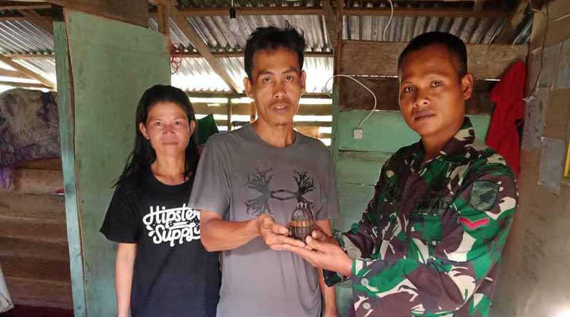 SINTANG, SKR.COM – Simpati karena sering dibantu Babinsa, Suhandi (38) warga perbatasan menyerahkan secara sukarela granat nanas aktif yang selama ini disimpannya, Rabu (27/2/19).