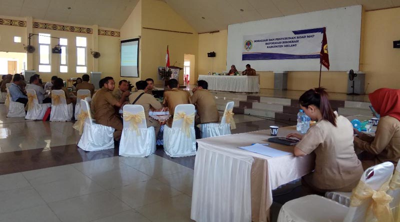 MELAWI, KN – Pemerintah Kabupaten Melawi menggelar sosialisasi dan penyusunan Road Map reformasi birokrasi Kabupaten Melawi, Selasa (16/7) di Pendopo Rumah Jabatan Bupati Melawi. Kegiatan tersebut dibuka oleh Asisten I Setda Melawi, Imansyah, dan dihadiri sejumlah pejabat di lingkungan pemerintah Kabupaten Melawi.