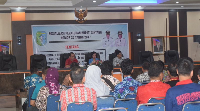 SINTANG, SKR.COM – Sekretaris Daerah Kabupaten Sintang, Dra. Yosepha Hasnah, M.Si membuka acara Sosialisasi peraturan bupati Sintang nomor 35 tahun 2017 tentang Koordinasi Tugas Assisten Sekretaris Daerah Kabupaten Sintang dalam urusan pemerintahan, pembangunan, kemasyarakatan, dan pelayanan publik di Kabuapten Sintang bagi operator SKPD di Lingkungan pemerintah Kabupaten Sintang tahun anggaran 2017 di Balai Praja Kompleks Kantor Bupati Sintang, Jumat (12/5/2017).