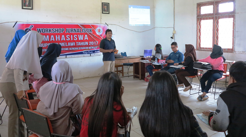 MELAWI, SKR.COM – Perhimpunan Jurnalis (Pena) Melawi menggelar workshop jurnalistik kepada mahasiswa, Sabtu (25/11). Kegiatan tersebut diikuti kurang lebih 20 peserta yang merupakan mahasiswa Sekolah Tinggi Keguruan dan Ilmu Pendidikan (STKIP) Melawi.