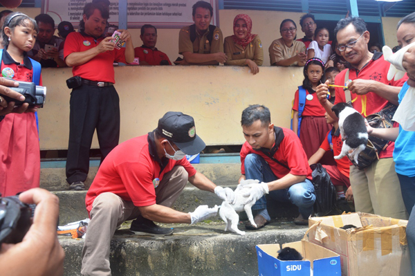 Pada kegiatan edukasi zoonosis rabies tersebut, juga dilakukan penyuntikan vaksinasi kepada beberapa anak anjing warga yang berada di sekitar kegiatan. Penyuntikan vaksin tersebut sebagai komitmen bersama masyarakat dalam pengendalian zoonosis rabies. (Irawan)