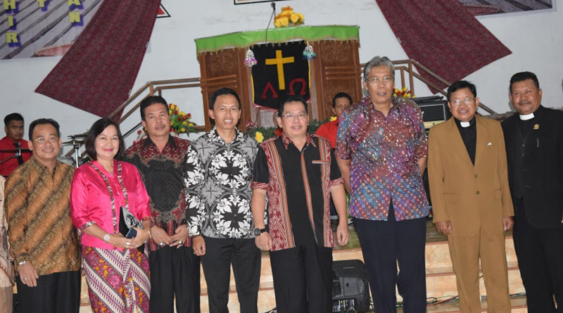 SINTANG, SKR.COM – Bupati Sintang, dr. Jarot Winarno, M.Med.Ph bersama wakil Bupati, Drs. Askiman, MM, Sekretaris Daerah, Dra. Yospeha Hasnah, M.Si dan Ketua DPRD Sintang, Jeffray Edward menghadiri perayaan natal bersama warga dari Persatuan Dayak Wilayah Kayan (PERDAWIKA) di Gereja GKE Petra Sintang, Minggu (15/1/2017).