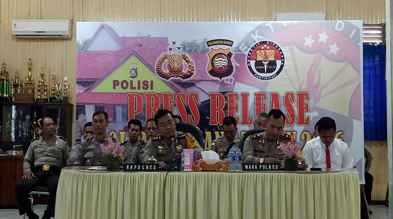 SINTANG, SKR.COM – Kapolres Sintang AKBP Suharjimantoro didampingi Wakapolres Kompol Pulung memimpin langsung kegiatan Press Release akhir tahun yang digelar di Aula Polres Sintang Sabtu (31/12/2016) kemarin.