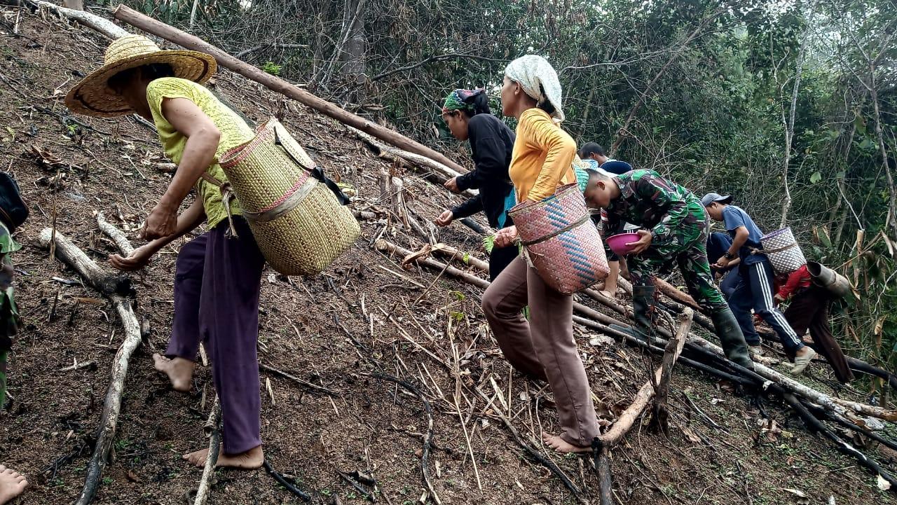 SANGGAU, SKR.COM – Satuan Tugas Pengamanan Perbatasan (Satgas Pamtas) Batalyon Infanteri Mekanis (Yonmek) 643/Wanara Sakti Pos Panga melaksanakan gotong-royong bersama masyarakat menanam padi di Dusun Segirau, Desa Engkahan, Kecamatan Sekayam, Kabupaten Sanggau, Rabu (18/9/19)