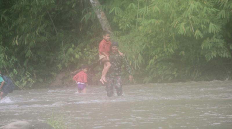 “Musim hujan begini arus memang sedang deras, jadi anggota membantu menyeberangkan anak-anak itu. khawatirnya kalau tidak diseberangkan mereka hanyut,” kata Dansatgas Pamtas Yonif 511/DY.