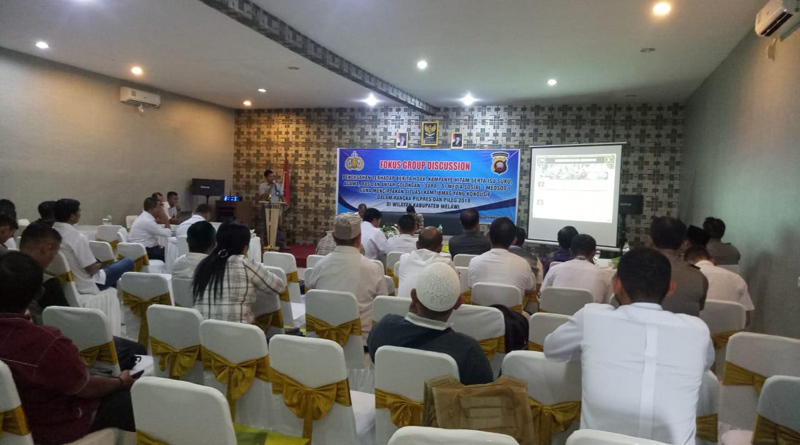 MELAWI, SKR.COM – Untuk menciptakan situasi kamtibmas yang kondusif menjelang Pemilu Legislatif (Pileg) dan Pemilihan Presiden (Pilpres) 2019, Polres Melawi melalui Sat Binmas mengadakan Focus Grup Discussion (FGD), Rabu (26/9) di Aula Pertemuan salah satu hotel di Nanga Pinoh. Kegiatan tersebut dibuka Waka Polres Melawi, Kompol Jajang, dan dihadiri KBO Reskrim, Kominfo, Komisioner KPU, Camat, Kades, Bhabinkamtibmas, Bhabinsa, Tokoh Masyarakat, Tokoh Agama dan Media Massa.